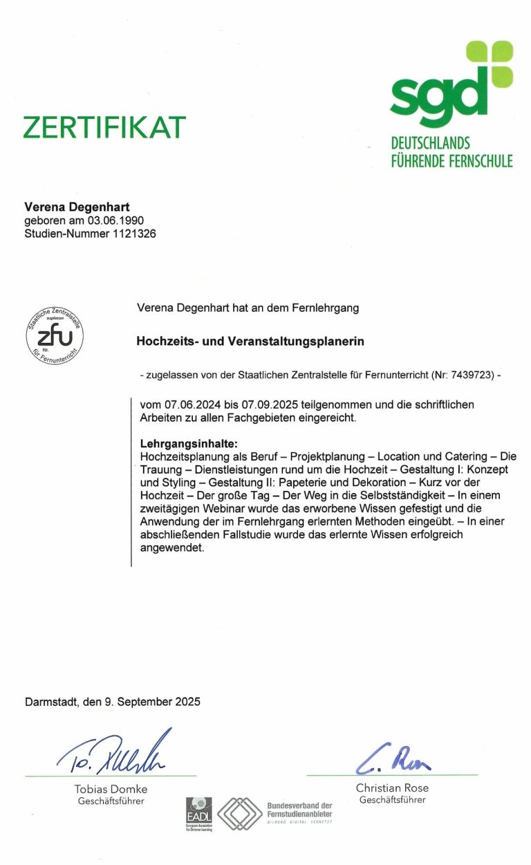 Die Leidenschaft: Mit meiner Ausbildung zur Hochzeits- und Veranstaltungsplanerin (SGD)2025, habe ich dieses fachliche Know-how mit kreativer Vision und Branchenwissen vereint.